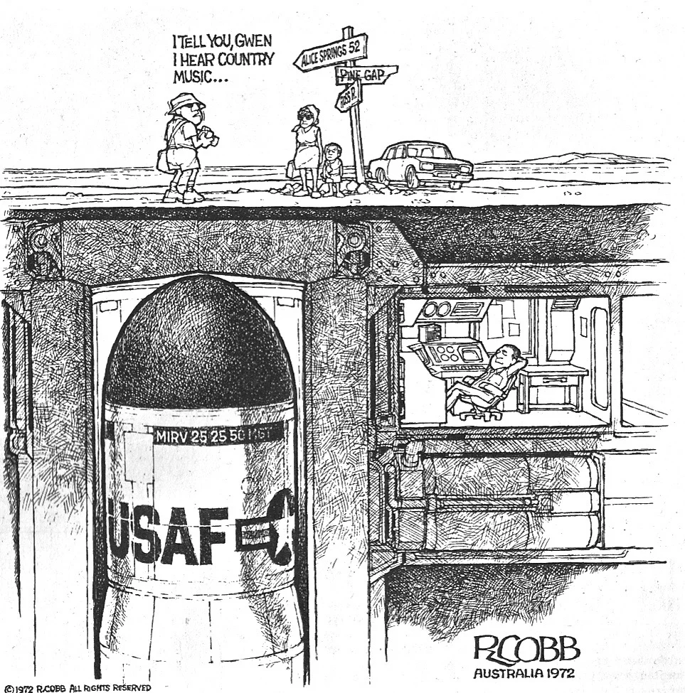 American cartoonist Ron Cobb drew this for issue #3 of The Digger on 3 September 1972. The soon-to-be elected Whitlam Labor Party was discussing closing or taking over the US spy-satellite station in the centre of Australia, a proposal revived by Malcolm Fraser shortly before his death last year.