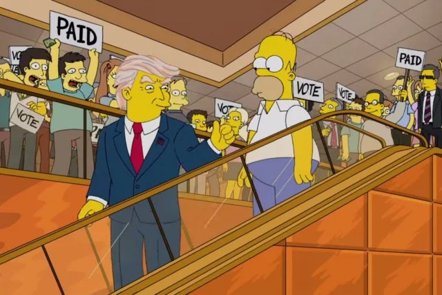 The Simpsons cartoon series took up the claim that Donald Trump paid people to seem like supporters during his speech announcing his intentions to run for president.
