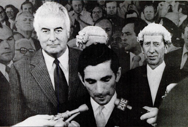 Shortly after 4:30 p.m., Whitlam appeared on the steps of Parliament House before a swelling crowd of supporters chanting, “We want Gough!” At that moment, a short, thin man in a black suit appeared to read a proclamation from Governor General Kerr shutting down the parliament. Whitlam loomed above the unfortunate official, who ended his declaration with the traditional invocation, “God save the Queen.” Whitlam could restrain himself no longer. Seizing the microphone, to the cheers of the crowd, he boomed, “Well may we say, ‘God save the Queen,’ because nothing will save the governor general!” In a parting moment of defiance, Whitlam urged Australians: “Maintain your rage.”